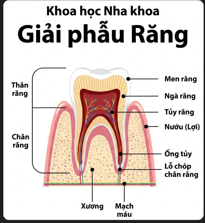 Cấu trúc răng của chúng ta có 3 lớp: Ngoài cùng là Men răng (cứng nhất, không có cảm giác), ở giữa là Ngà răng (chứa hàng ngàn ống nhỏ li ti dẫn vào tủy) và trong cùng là Tủy răng (chứa dây thần kinh).